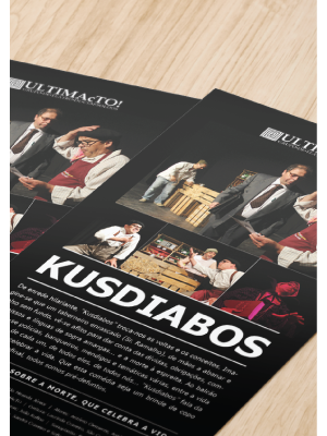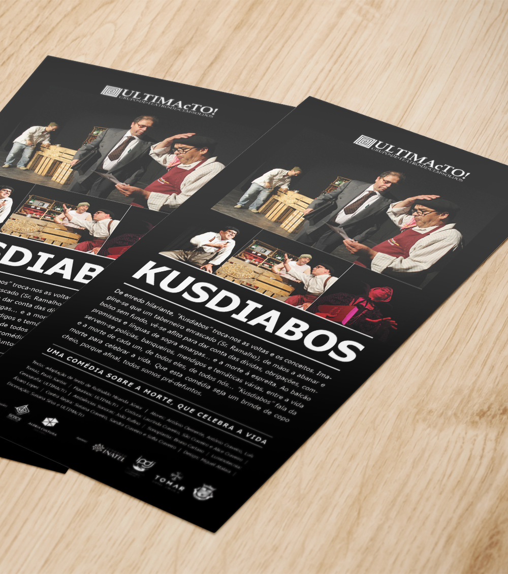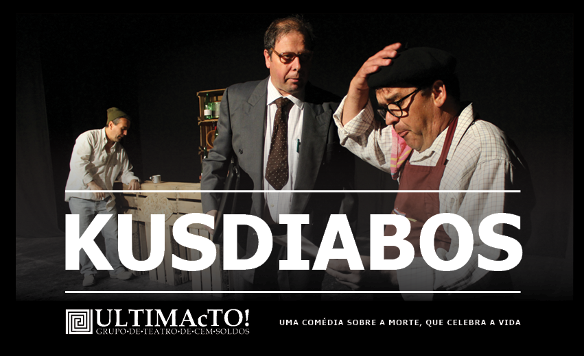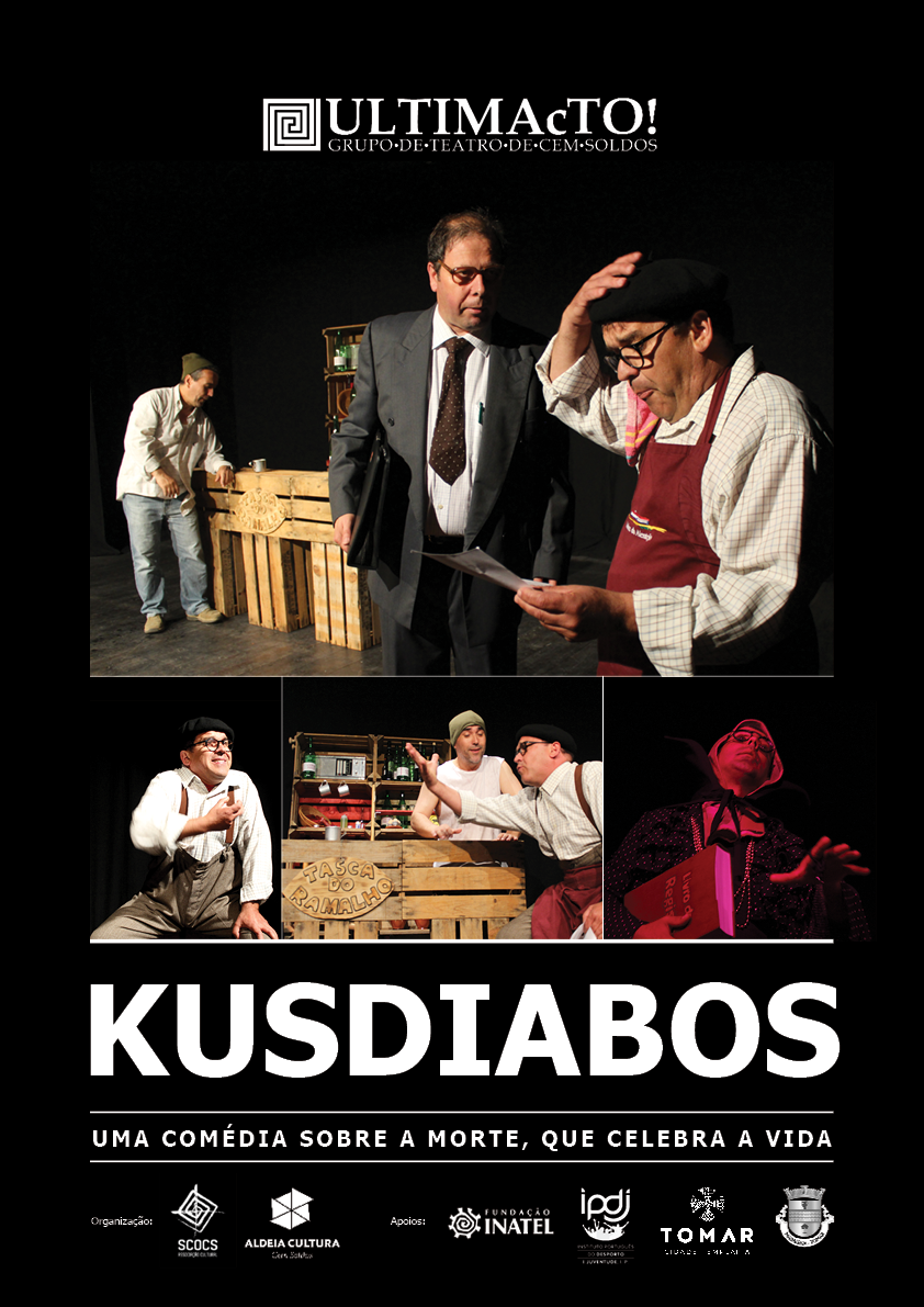 “Kusdiabos” é uma das peças de teatro levadas a palco pelo grupo de teatro cem-soldense ULTIMAcTO, adaptação de um texto de Rutinaldo Miranda Júnior. “Uma comédia sobre a morte, que celebra a vida” aqui sob a forma de cartaz, flyers e imagens para as redes sociais.